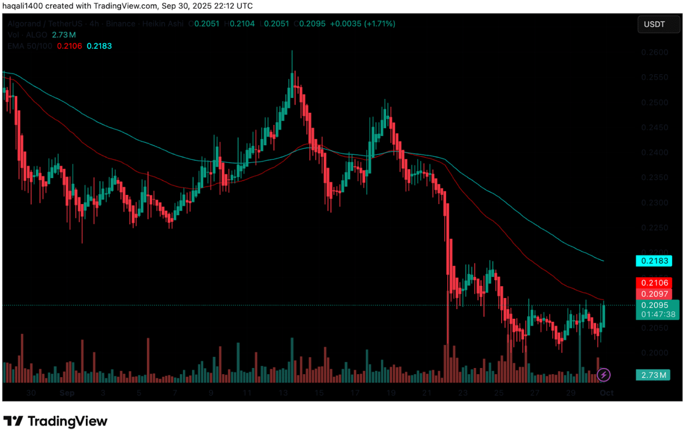 The ALGO/USDT chart on TradingView shows the token holding above support after bouncing back from September lows.