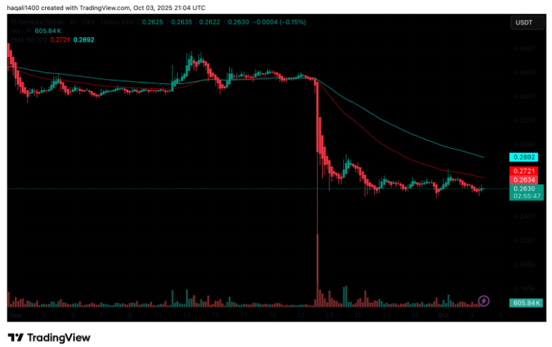 The token of Pi Network is condensing around the value of $0.26 following a severe decrease in September, and traders are observing whether support will be maintained.
