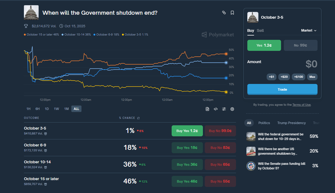 The US government shutdown has entered its third day, and prediction markets are bracing for a long battle. Data from Polymarket shows: