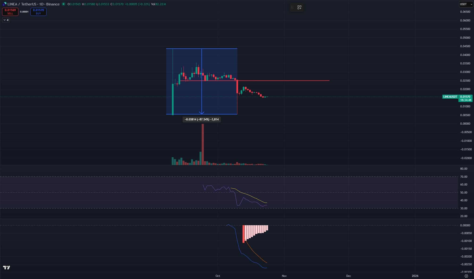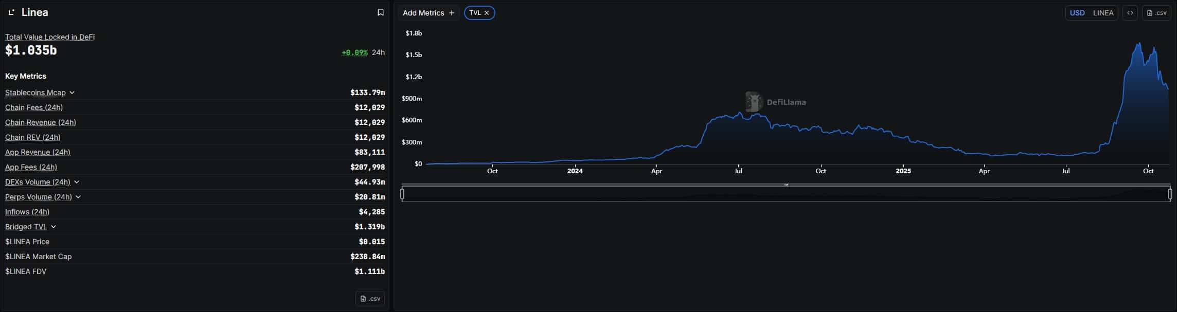 Despite impressive fundamentals, the LINEA price has suffered one of the steepest declines among major altcoins this quarter. From highs near $0.043 in early September, LINEA collapsed by over 87% following its October 10 unlock of 1.02Bn tokens and the flash crash of the overall crypto market.