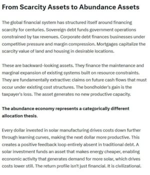 While I do think that tokenizing existing tradable assets will keep growing steadily, the biggest impact from tokenization can be achieved by tokenizing abundance assets.