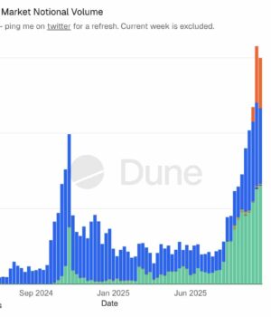 Dune Analytics shows that weekly notional volumes on major prediction platforms climbed to about $2Bn in November.
