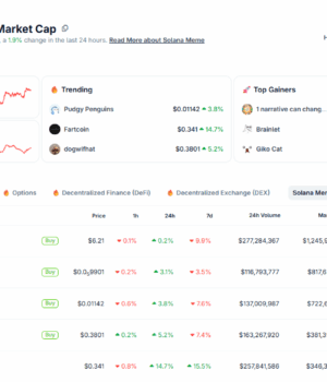 As Solana stabilizes, some of the top meme coins running on the modern chain are also firm. TRUMP crypto, Pengu, WIF, and Fartcoin are in the green. So far, the total market cap of Solana meme coins is up 2% to $5.7 billion.
