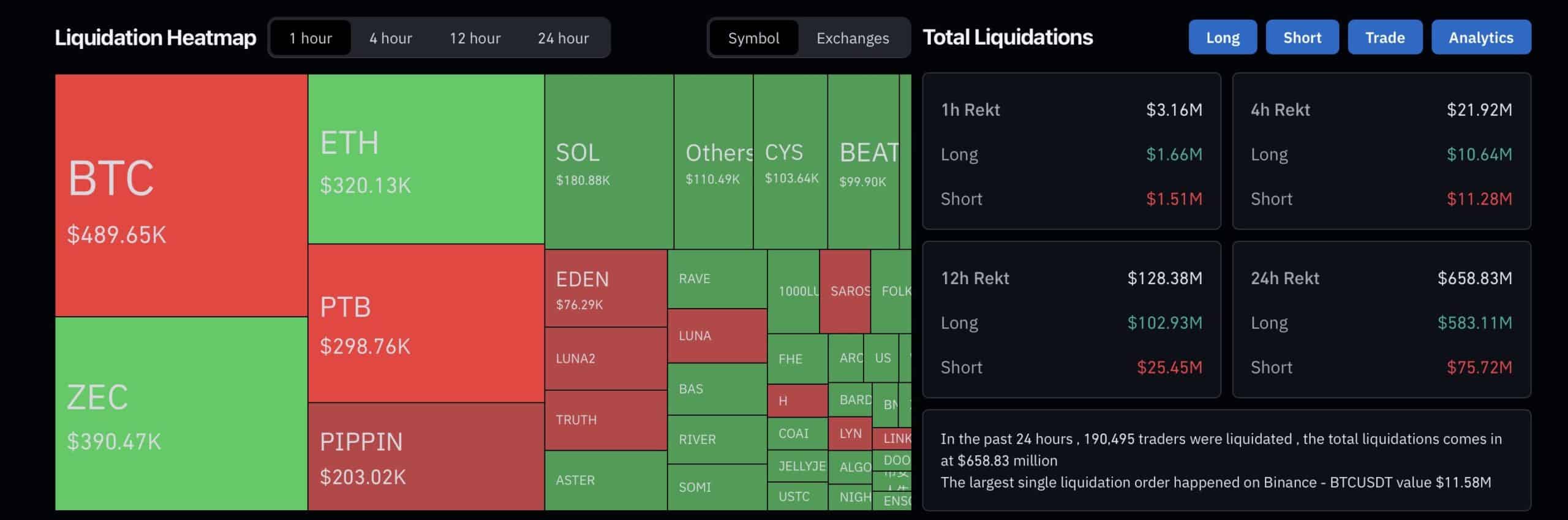 Another day, another red Bitcoin candle. Why is crypto crashing? Liquidations have exceeded $658 million in the last 24 hours, primarily affecting optimistic positions, intensifying the downward move amid thinner, year-end trading volumes. This deleveraging process appears driven by efforts to scale back excessive borrowing built up during recent rallies, leading to cascading sales as positions are forcibly closed.