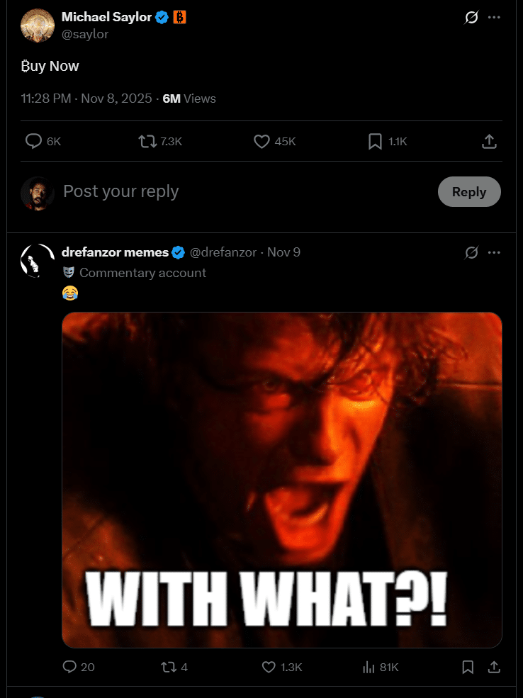 Imagine thinking that changing the name from Microstrategy stock to Strategy was a good idea. Anf now Michael Saylor just floated a message on X that said “Buy Now,” which comes exactly three years after FTX begged people to buy FTT.