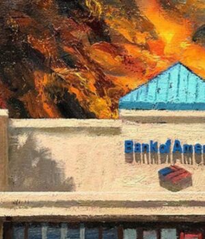 BMAG: Alex, you started the Banks on Fire series in 2009 — not in a studio, but on the sidewalk, en plein air, in front of the actual buildings. For people encountering this work for the first time, can you set the scene? What was happening in the country when you first set up an easel across the street from a Chase branch, and what made the sidewalk the right place to paint it?