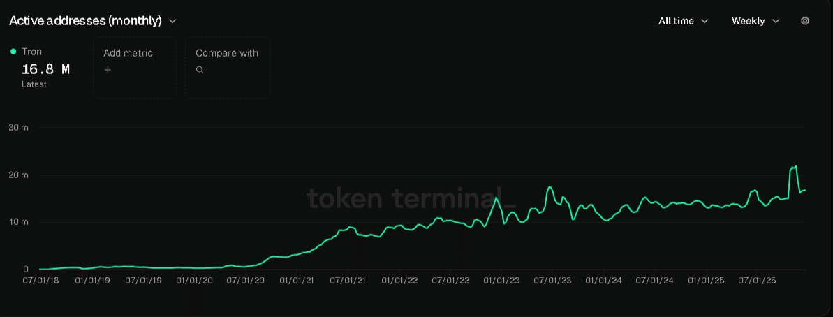 TRON slashed average network fees by about 60% in August 2025. Lower fees made it cheaper for people and businesses to move money, which pushed TRON past BNB Chain and Solana in daily active users. At the same time, TRON cemented itself as the main home for USDT, the largest stablecoin (a token that tracks the price of a real-world currency like the US dollar).