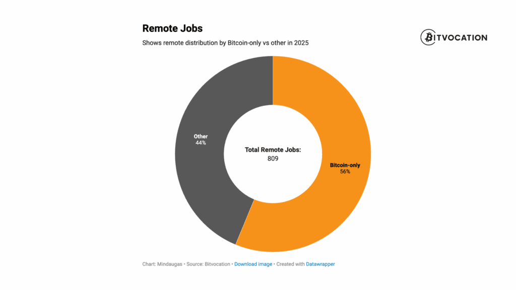 Remote jobs shrunk slightly, losing 10% to 2024 numbers. Nevertheless, almost half of all jobs in the report are remote jobs with Bitcoin-only companies offering 56% of all remote opportunities.