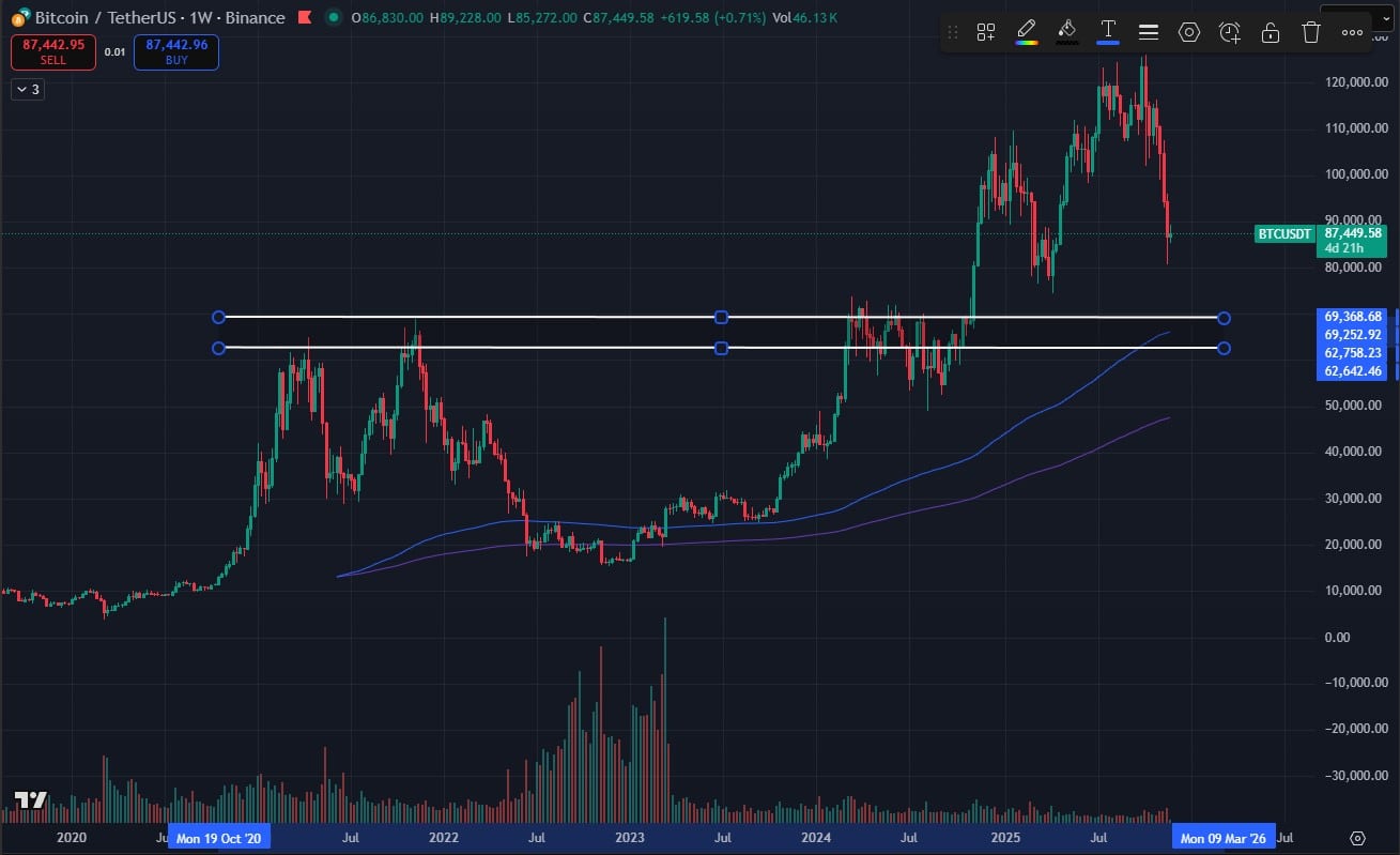 However, risk remains high. A decisive break below $80K opens the door to deeper support around. $69K-$62 support channel, corresponding with the previous ATH and the 200 EMA and SMA on the weekly time frame.